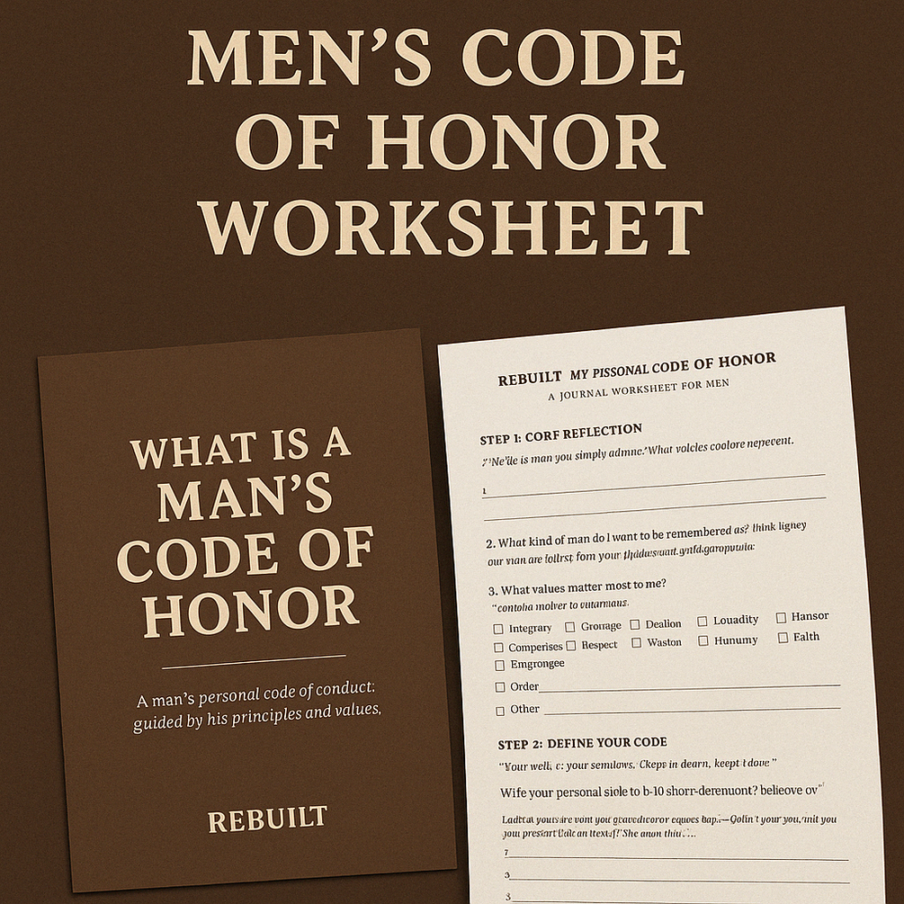 This printable, guided Men’s Code of Honor Worksheet helps you define your own personal values, beliefs, and principles—so you can live with integrity, strength, and direction every single day. Crafted by REBUILT for men who are reclaiming their lives after hardship, trauma, or loss, this tool is more than just paper. It’s a declaration. A compass. A clean start.