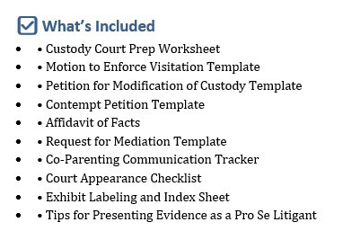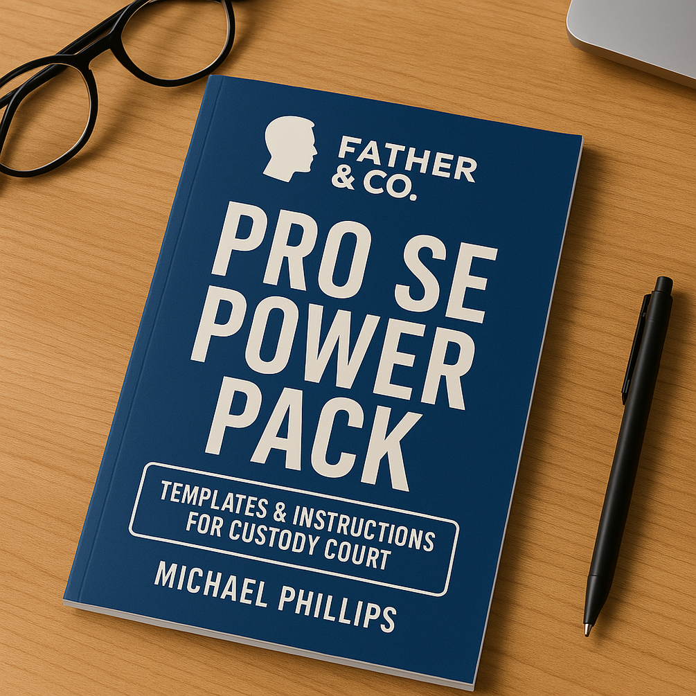 The Pro Se Power Pack (Volume 1) is a comprehensive toolkit for self-represented fathers navigating custody court. This resource offers practical, easy-to-use legal templates and preparation tools designed to help dads stay organized, present their case clearly, and advocate effectively in court. Built by Father & Co., this guide empowers you to protect your rights and stay focused on what matters most—your child.